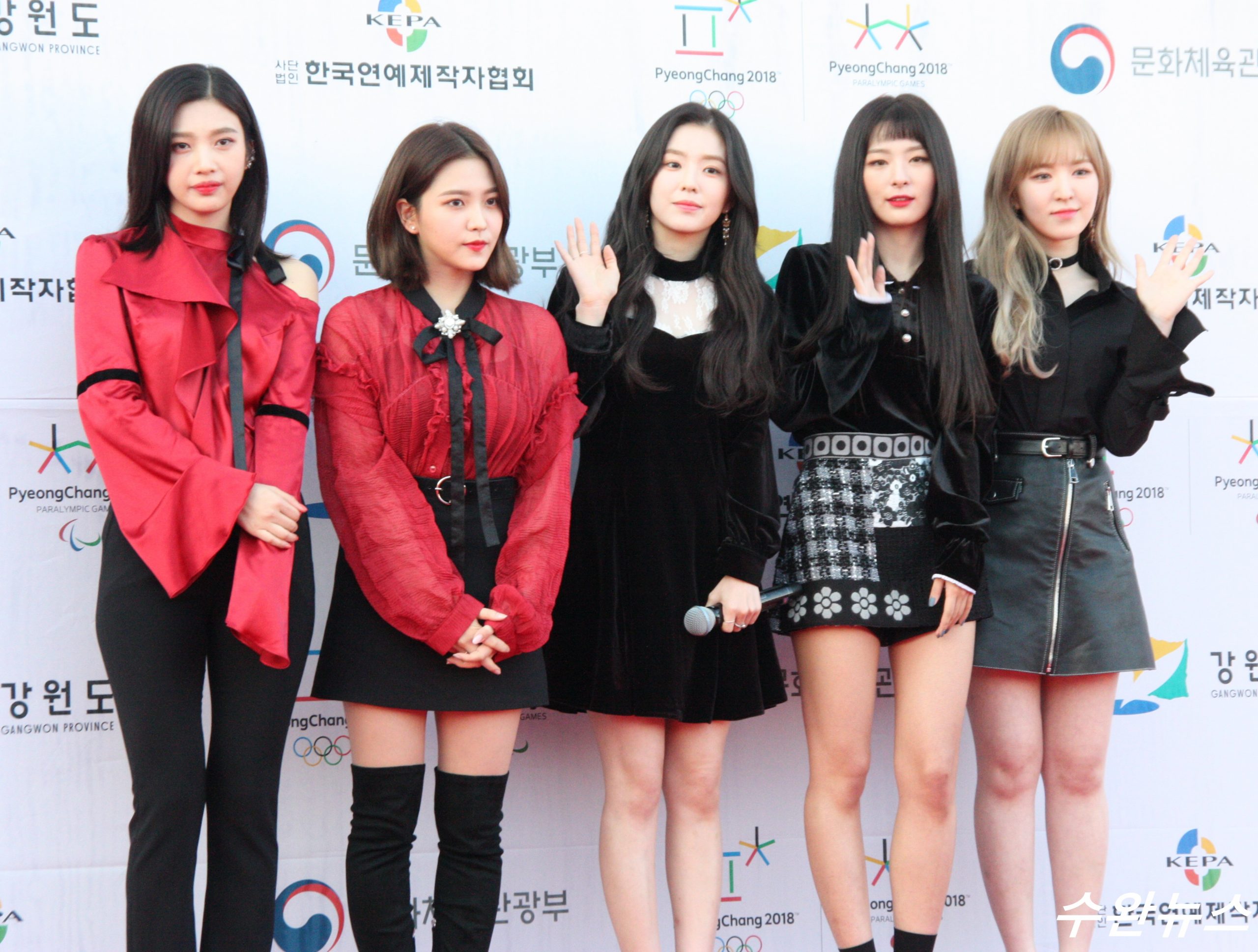 [수완뉴스=평창올림픽플라자] 오늘 (4일) 강원도 평창 올림픽플라자에서 경기장 오픈 기념으로 개최한 드림콘서트에 참석한 연예인들(몬스터엑스, 헤일로, 라붐, CLC, BIF, 다이아, 구구단, 프리스틴, 위키미키, 뉴이스트, 아스트로 등)이 레드카펫에 서서 포즈를 취하고 있다. / 사진: 김동주 선임기자