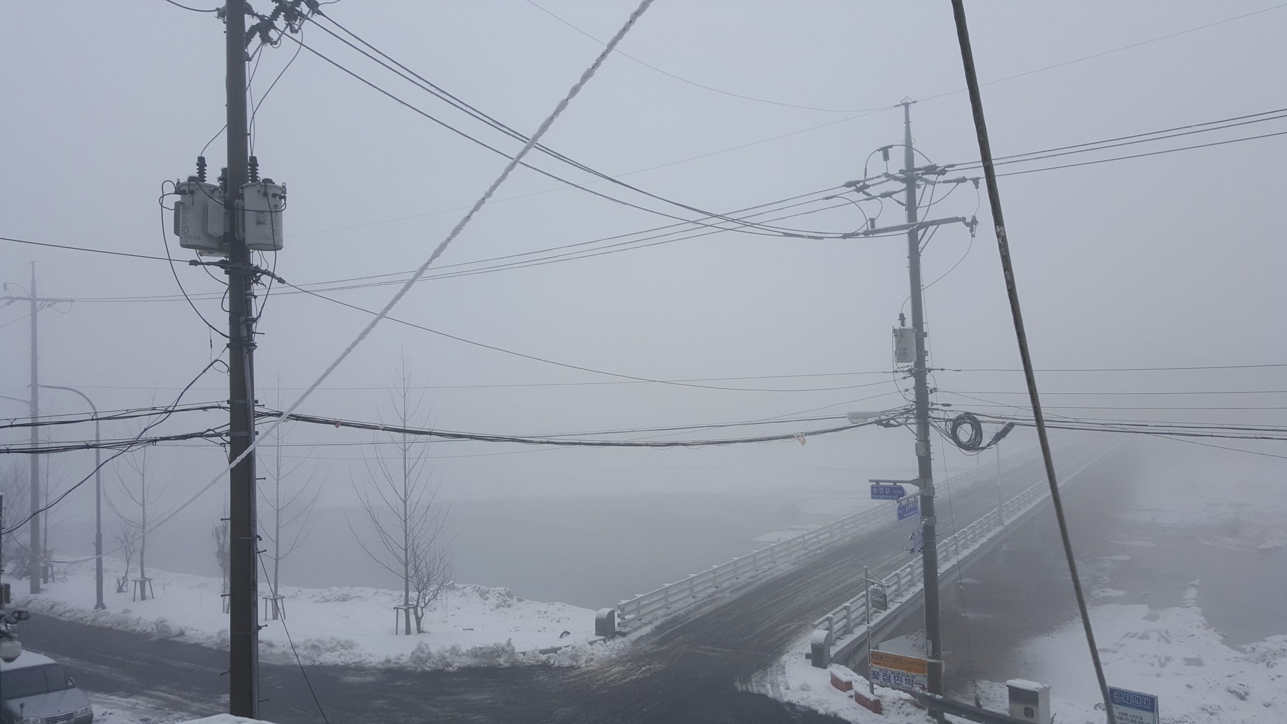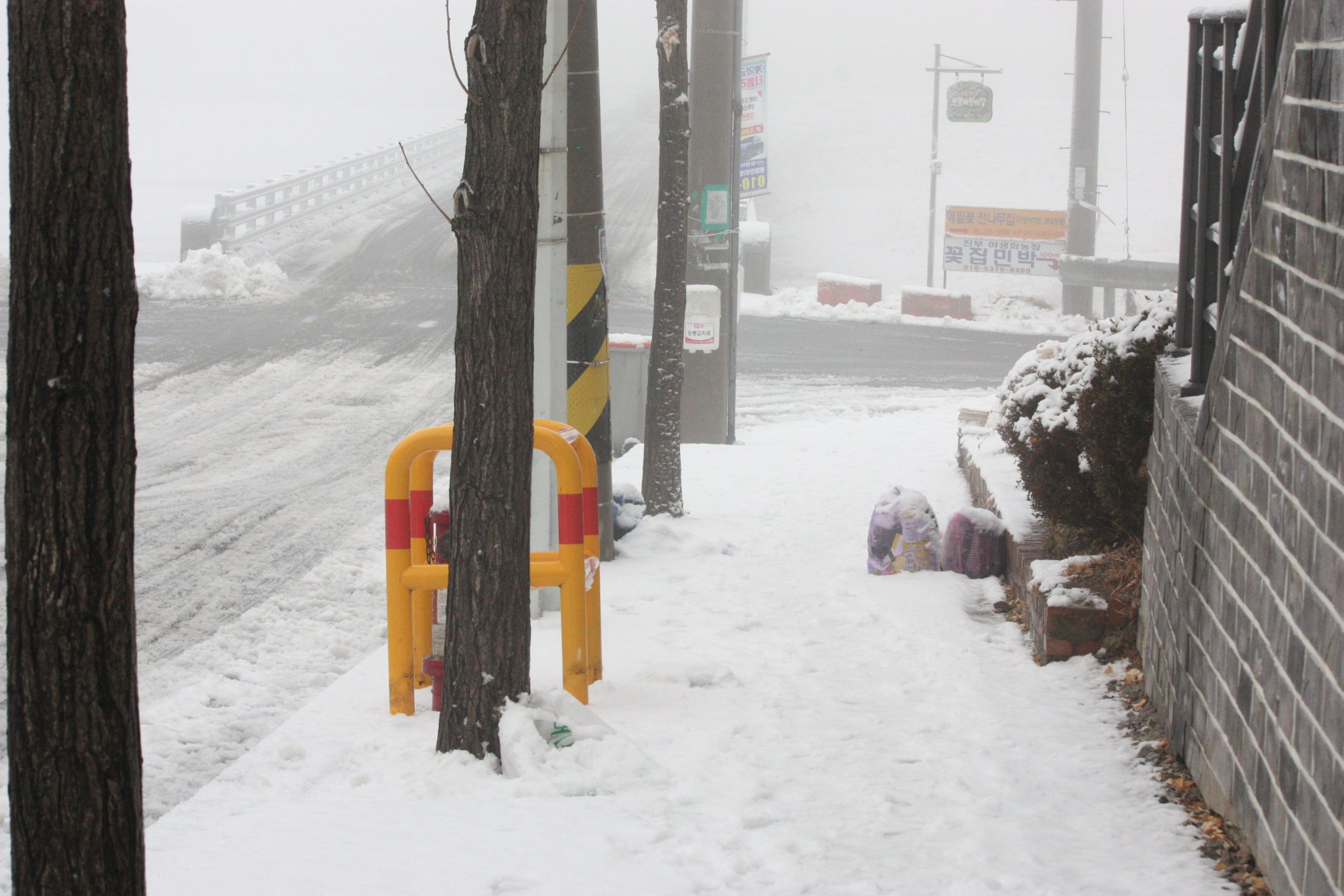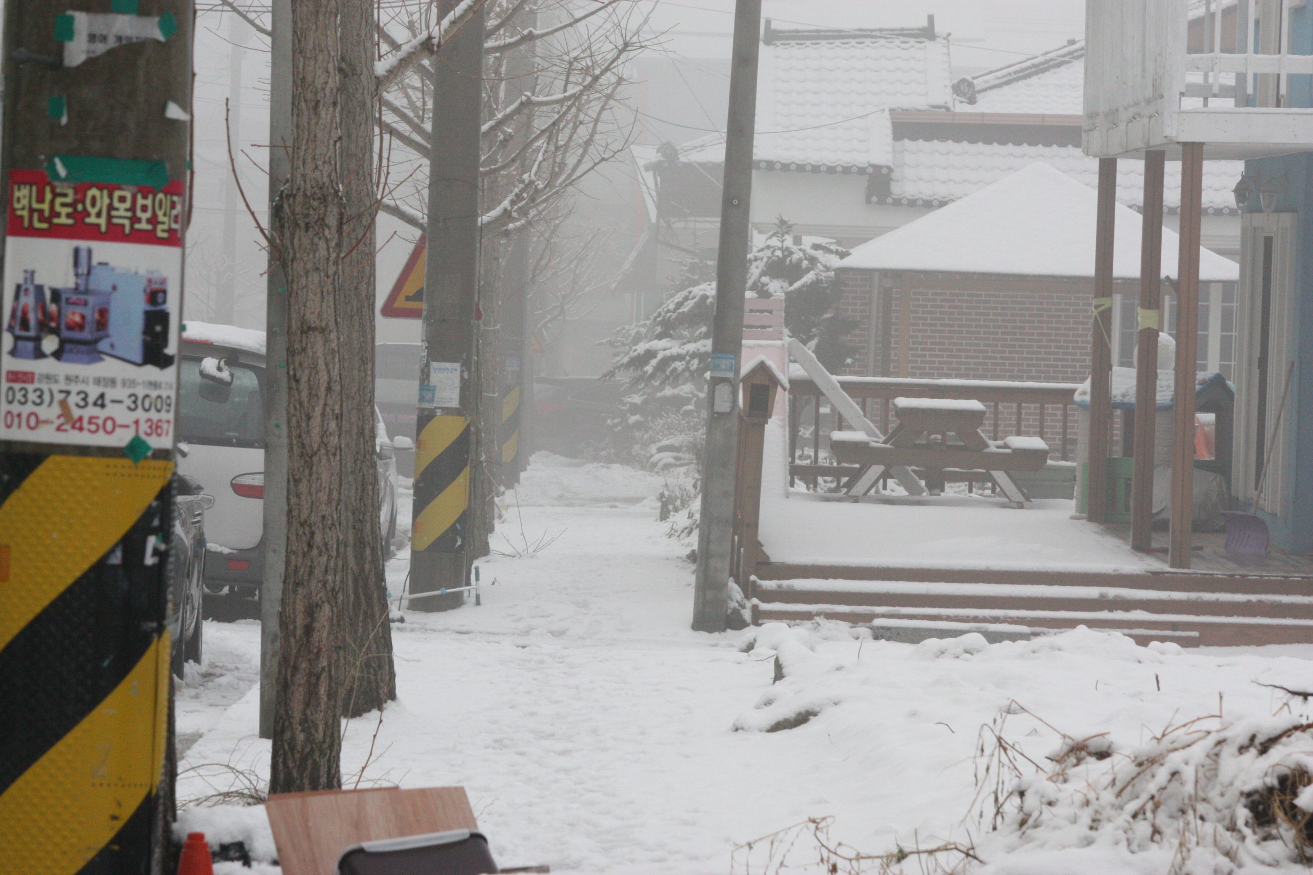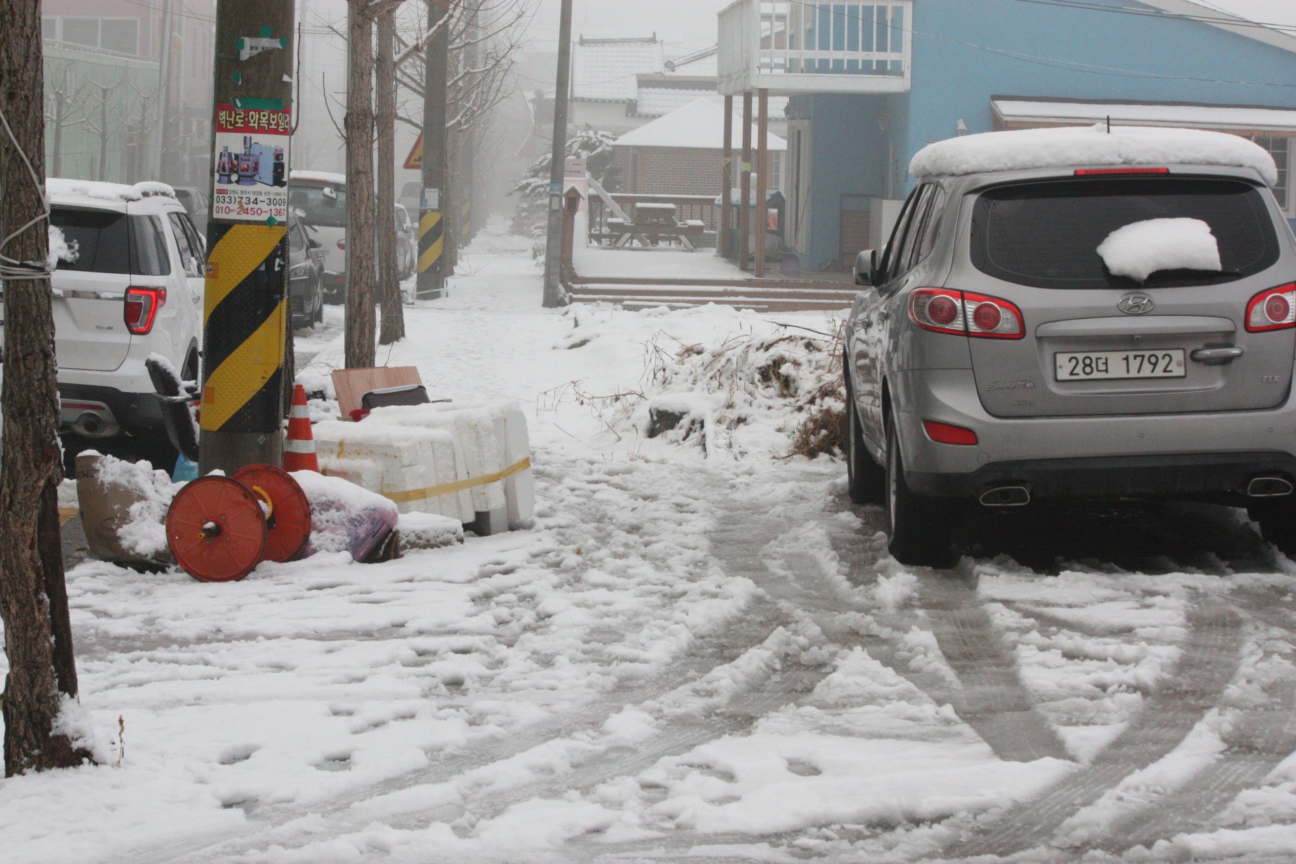 오늘 오전 9시 강원도 평창군 진부면 송정택지 부근의 풍경이다. 새벽사이 눈 오며 빙판길에 미끄러우니 송정택지를 지나는 주민들꼐서는 유의하시기 바랍니다.