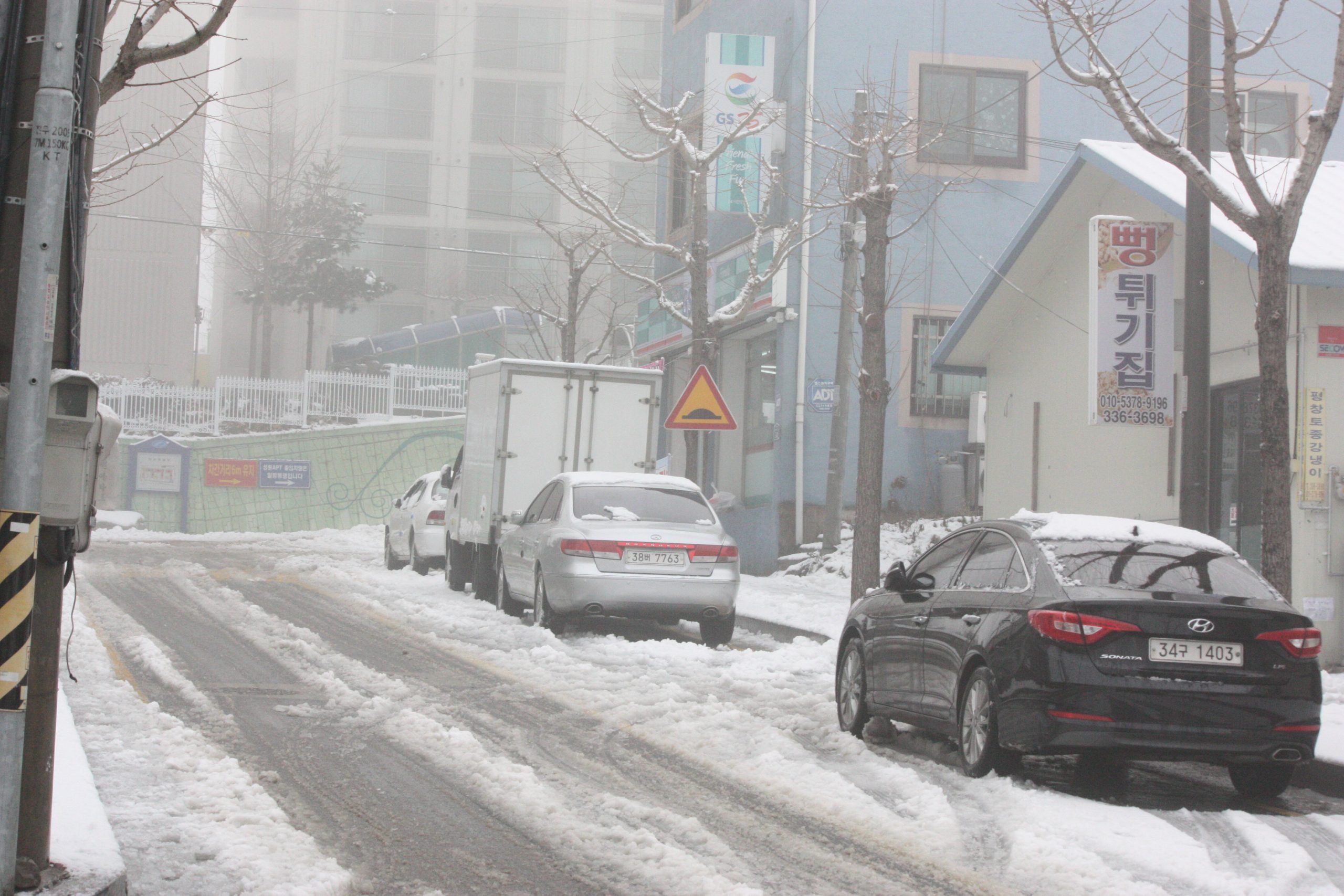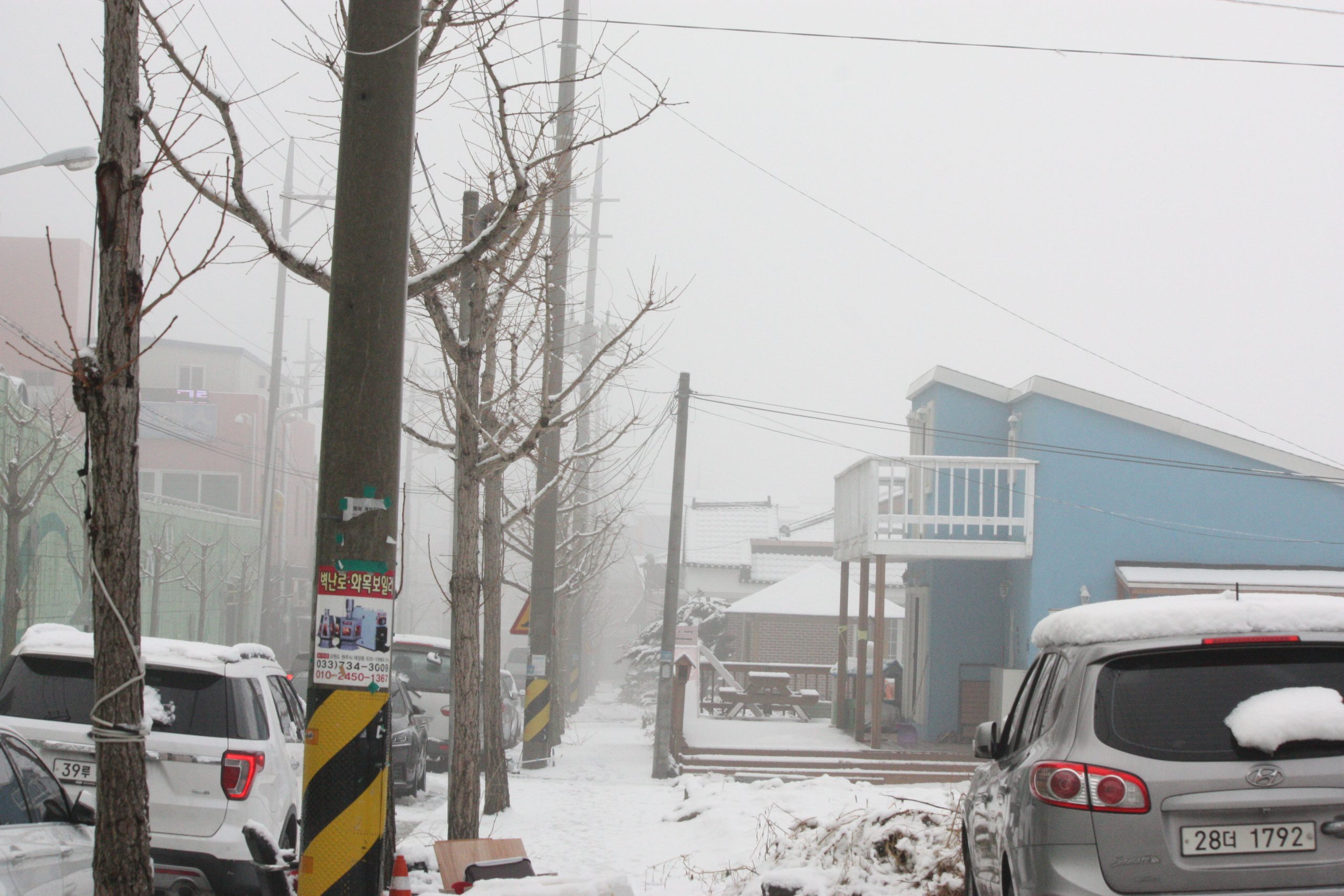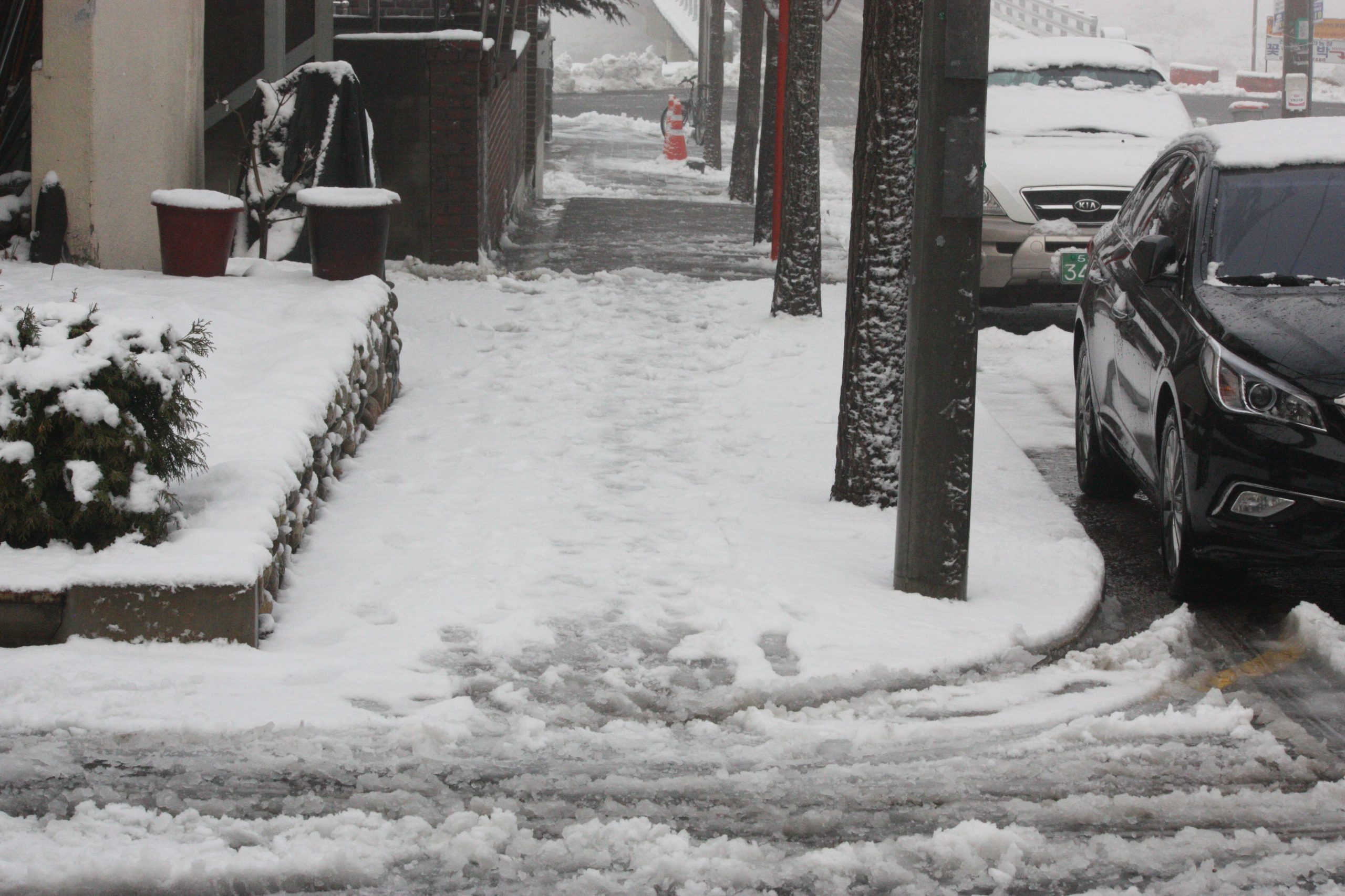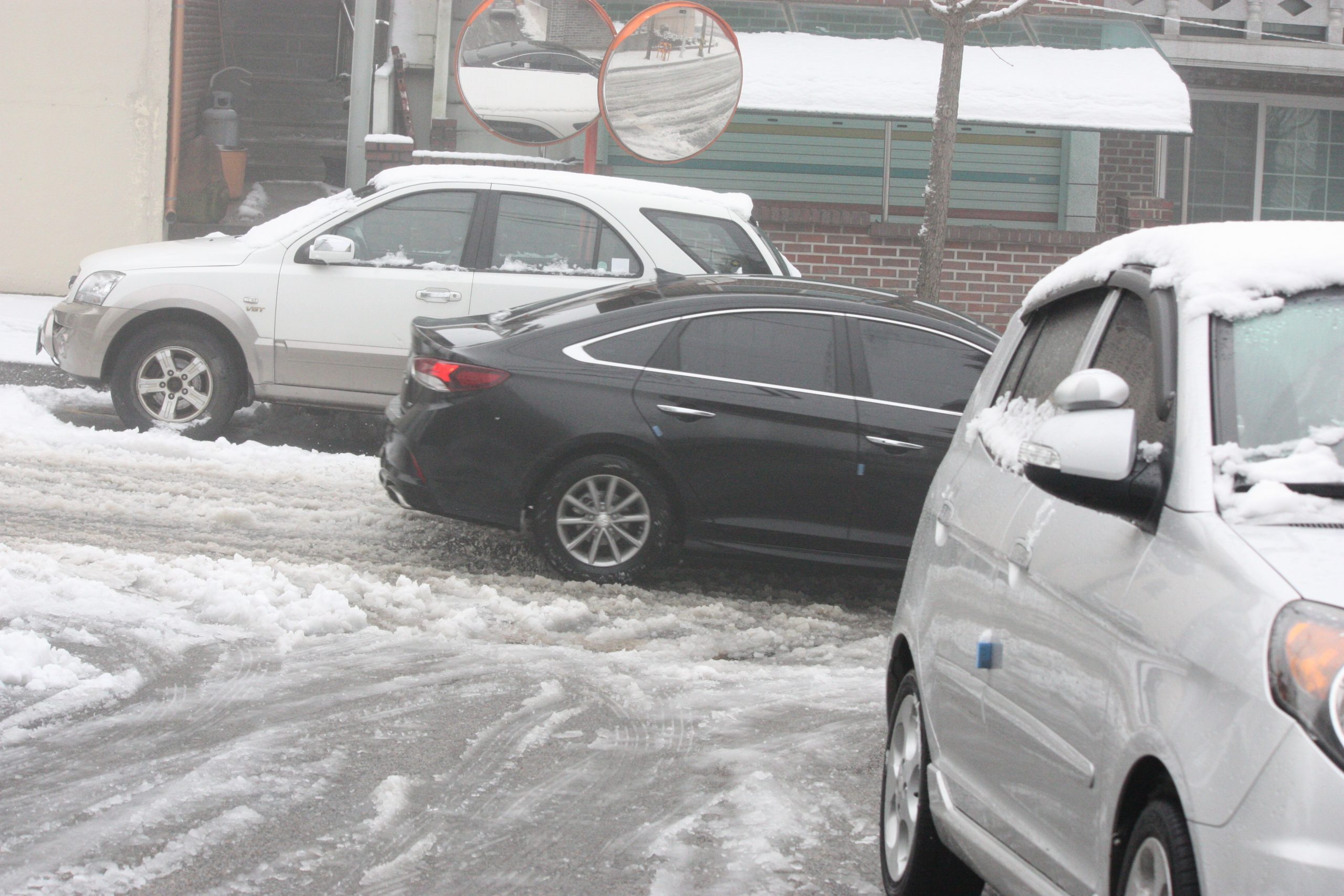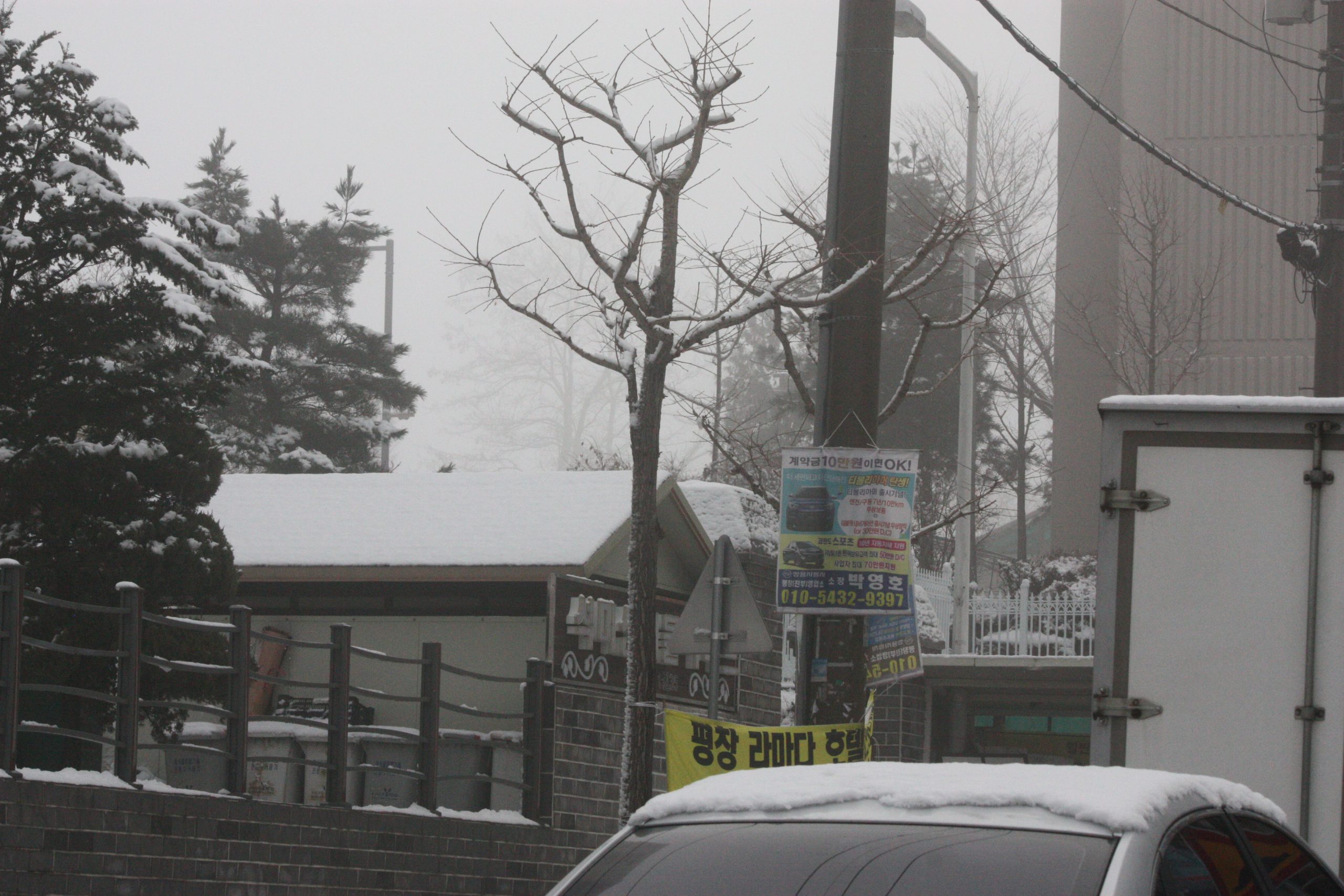 오늘 오전 9시 강원도 평창군 진부면 송정택지 부근의 풍경이다. 새벽사이 눈 오며 빙판길에 미끄러우니 송정택지를 지나는 주민들꼐서는 유의하시기 바랍니다.