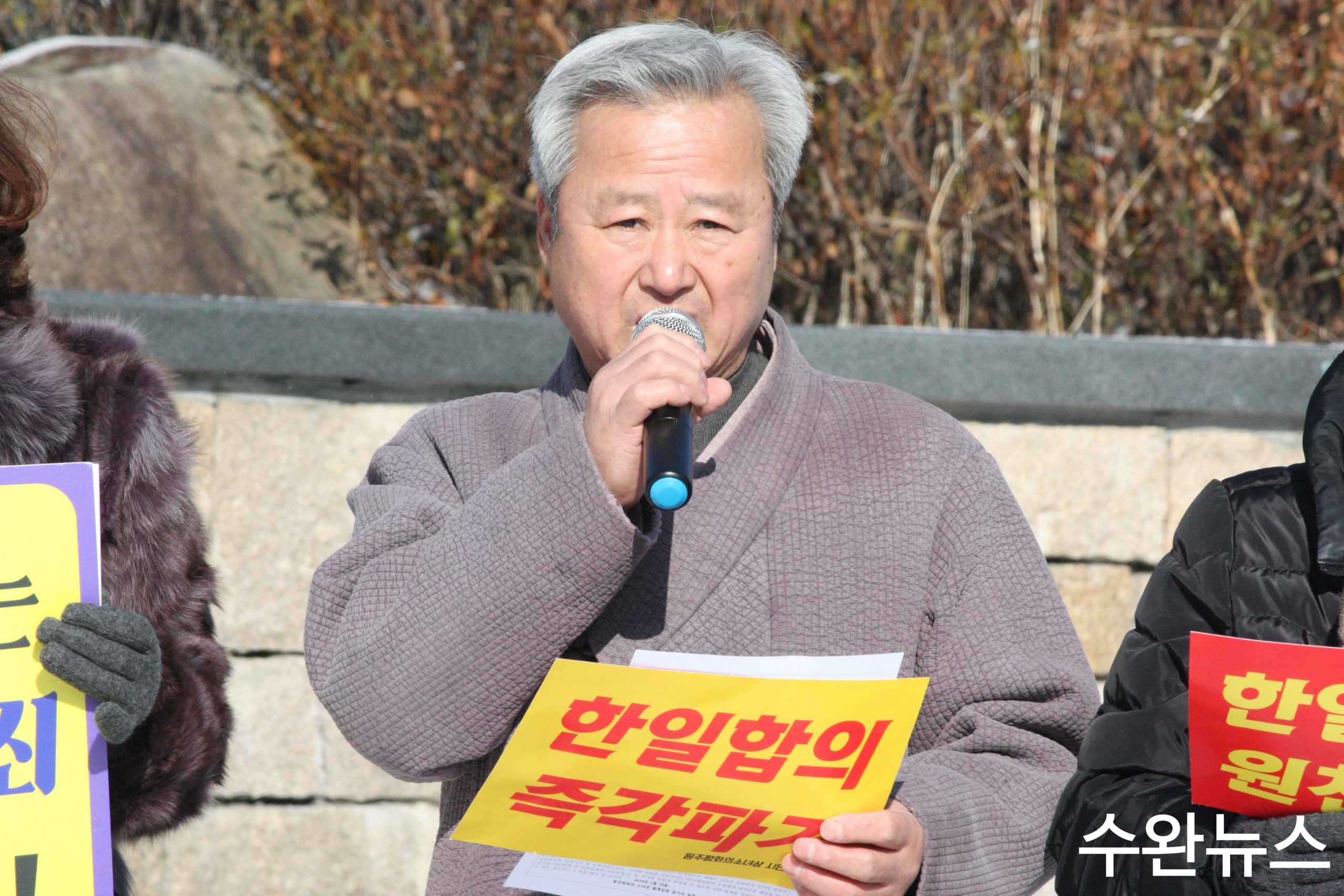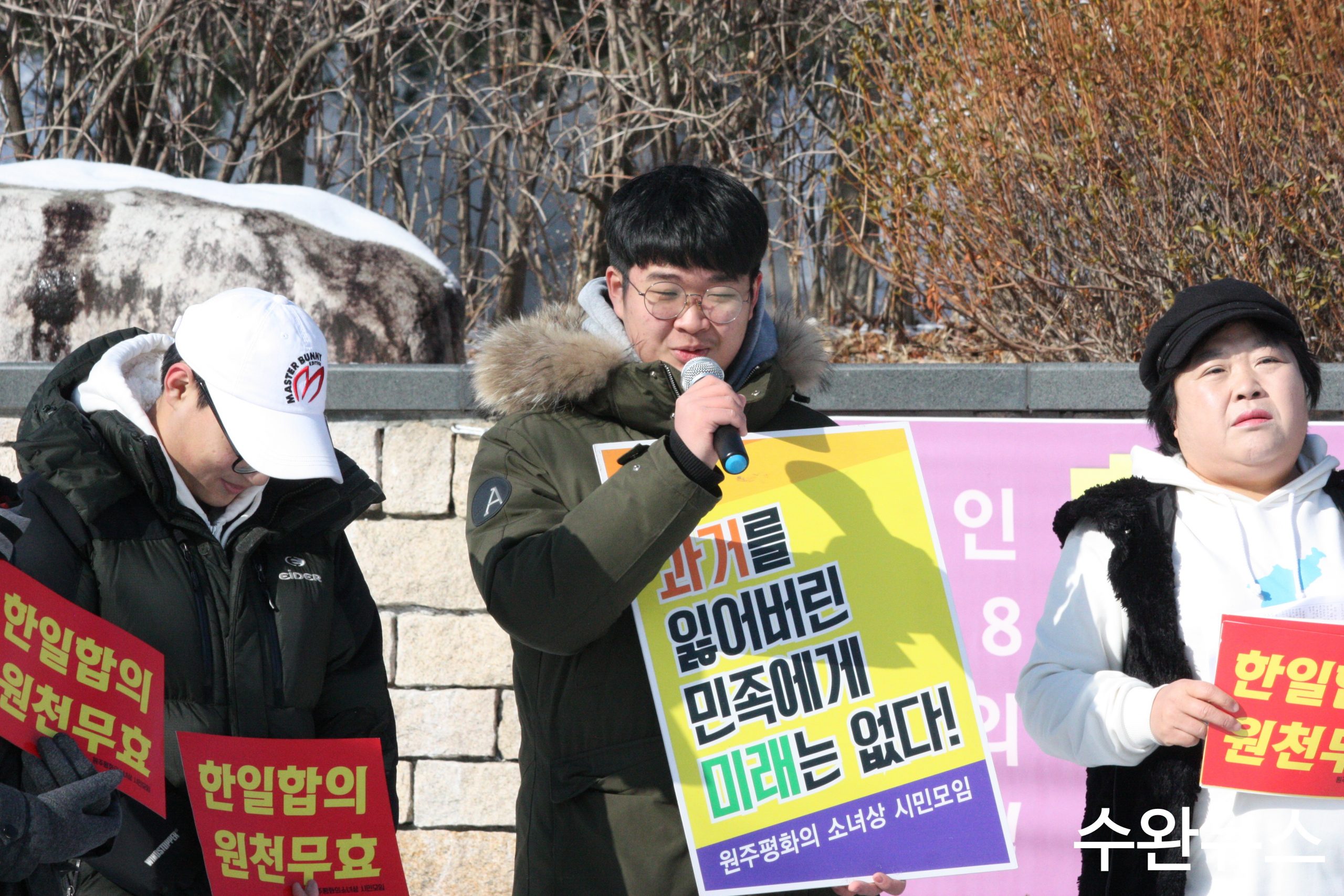 메인 이미지로 사용된 사진, 이 날 집회는 10일 오전 11시부터 원주시청 평화의 소녀상 앞에서 진행되었다. ⓒ 수완뉴스