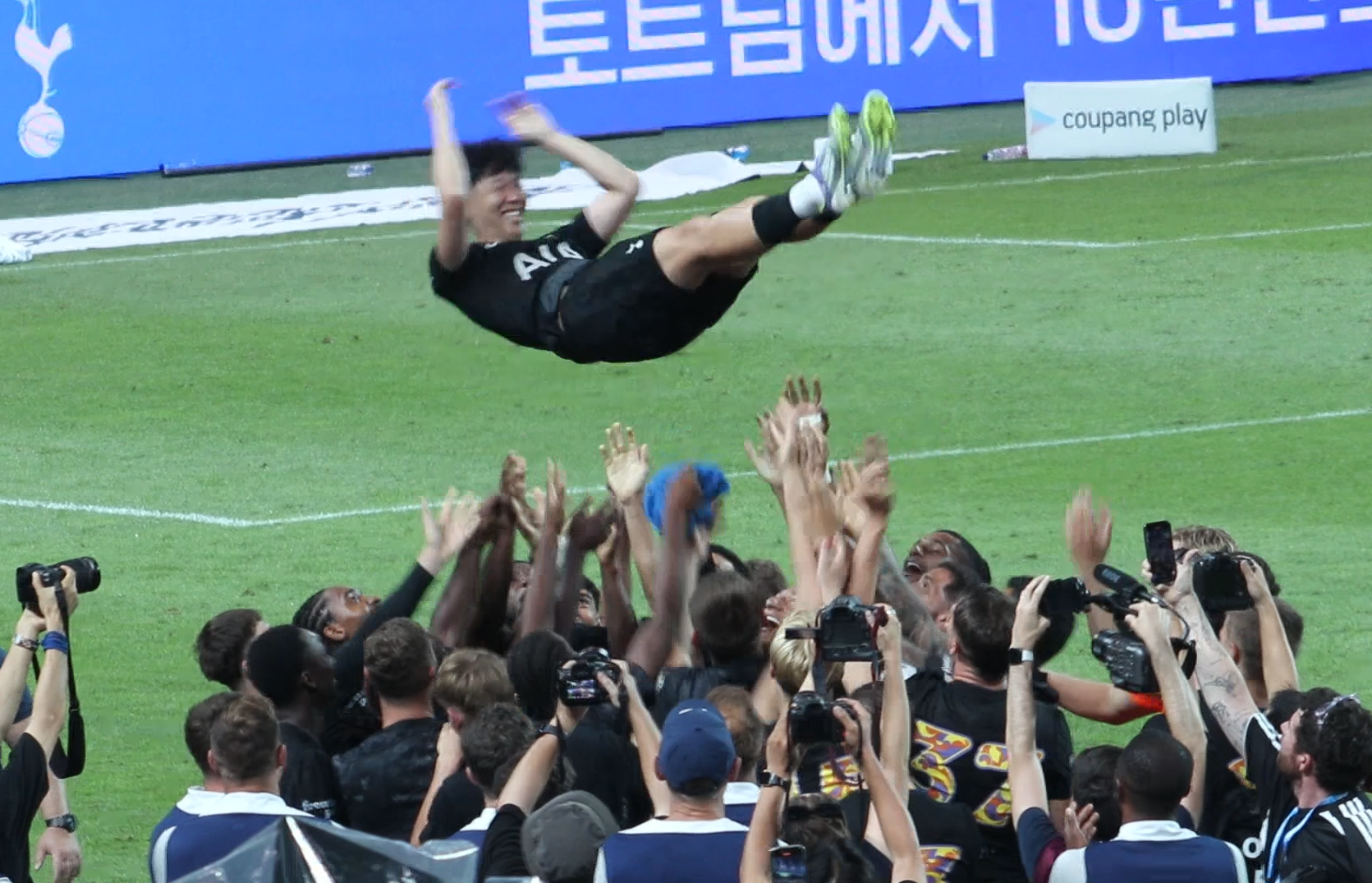 [수완뉴스=임주영 기자] 서울 마포구 서울월드컵경기장에서 ‘2025 쿠팡플레이 시리즈’가 지난 8월 3일 열렸다. 뉴캐슬 유나이티드 경기를 끝으로 토트넘에서의 선수 생활을 마무리하며, 동료 선수들에게 헹가래를 받고 있는 모습.