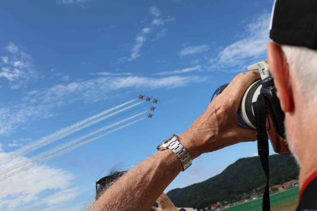 [수완뉴스=임주영 기자] 경기 성남시 서울공항에서 서울 ADEX 2025가 지난 10월 17일 열렸다. 외국인 관람객이 카메라 렌즈 너머로 보이는 블랙이글스 공연에 집중하고 있다.